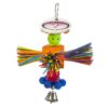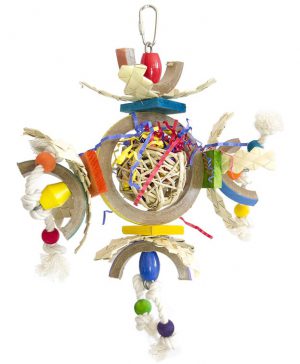 At the centre of the Space Station is a natural munch ball filled with paper shred. The core is surrounded with lots of moveable parts including balsa slats, cardboard bagels, palm braid, knotted cotton rope and vibrant wooden and plastic beads.
